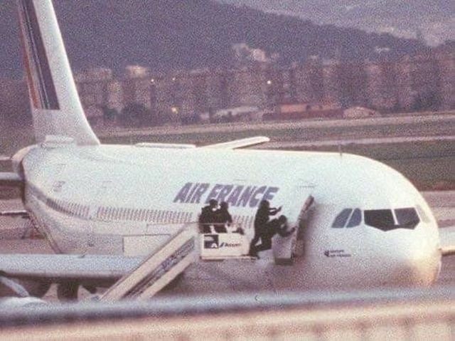 Французский спецназ GIGN во время освобождения заложников рейса 8969. В результате штурма все четверо алжирских террористов были убиты, ранения получили 25 человек, из них 9 сотрудников GIGN. 26 декабря 1994 года, Марсель.
