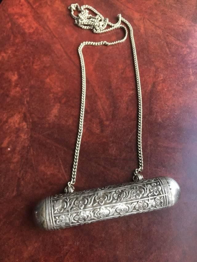 Ответ: «Это называют „молитвенным ожерельем“. Обычно его используют для ношения молитвенного свитка или какого-либо другого небольшого клочка бумаги, с ценными записями при себе»