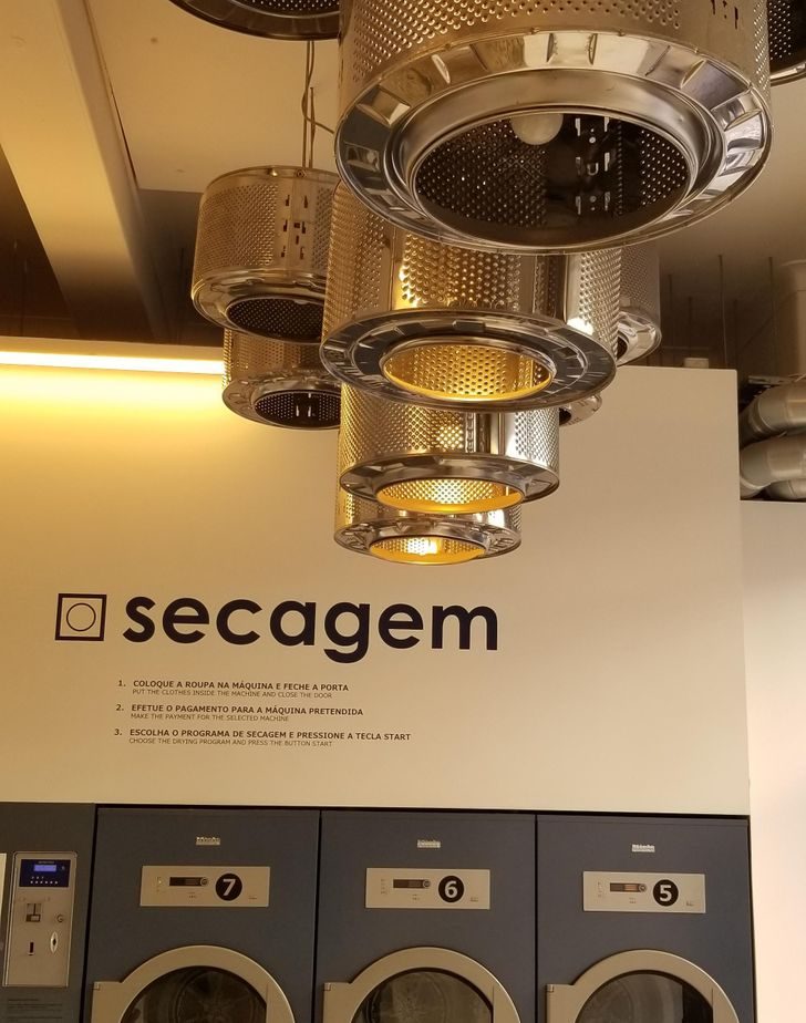 Прачечная в Лиссабоне, где вместо люстр подвешены барабаны от старых стиральных машин