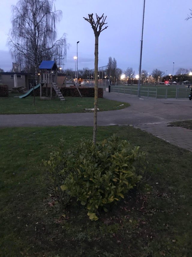 Кажется, что это дерево растет вверх ногами. На самом деле нас троллят садовники.