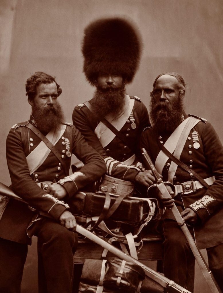 Солдаты гвардии Колдстрима (слева направо) Джозеф Нума, Джон Поттер и Джеймс Дил. Сфотографированы примерно в 1856 году. Крымская война велась с октября 1853 года по февраль 1856 года.