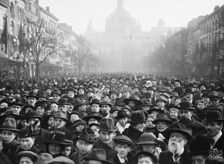 Граждане Антверпена на улицах города через несколько часов после объявления перемирия. Люди вышли, чтобы отметить окончание Первой мировой войны. Исторический снимок сделан 11 ноября 1918 года.