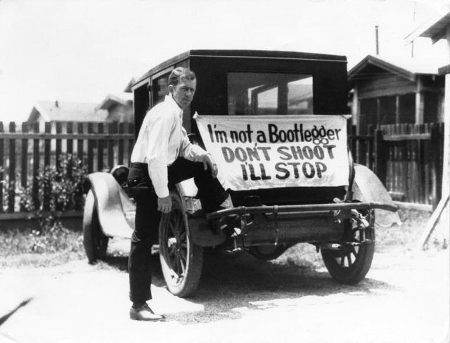 Гражданин, опасающийся за свою безопасность во время Сухого закона, с надписью на машине «Я не бутлегер, не стреляйте», 1929 год.