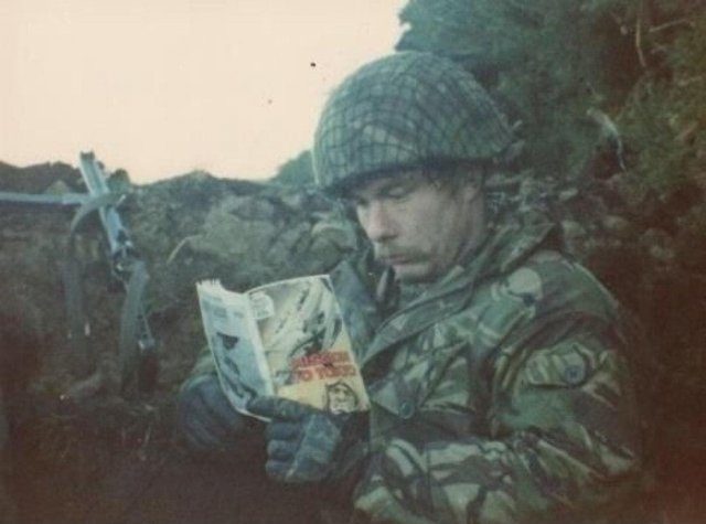 Британский боец Стив Тайер на позиции с пистолетом-пулемётом «Стерлинг», 1982 год. Фолклендские острова.