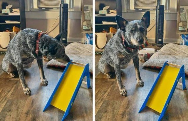 Собака явно разочарована ступеньками, купленными для нее.