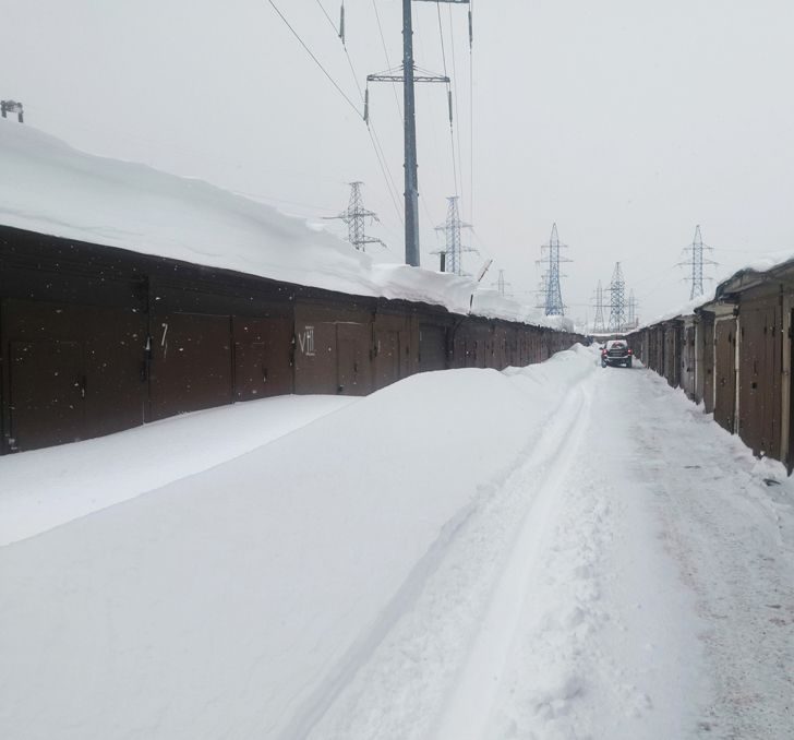Снега за ночь немало навалило и владелец гаража с правой стороны кадра хвастается своей удачей