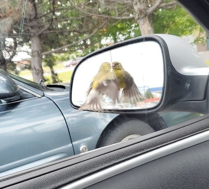Птичка попала в объектив точно перед тем, как ударилась о зеркало заднего вида