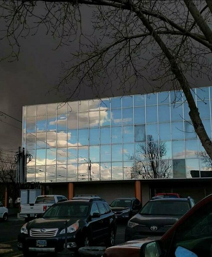 Во время шторма небо отражается в зеркальной поверхности здания