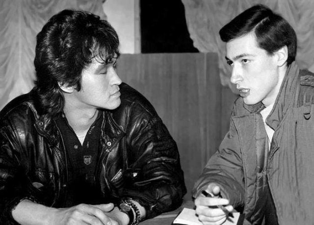 Украинский журналист Дмитрий Гордон берёт интервью у Виктора Цоя для газеты «Вечерний Киев» перед концертом группы «Кино». Апрель, 1990 год