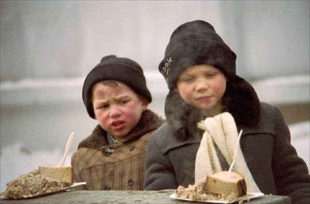 Бездомные дети получают благотворительный обед. Москва, 1995 год.