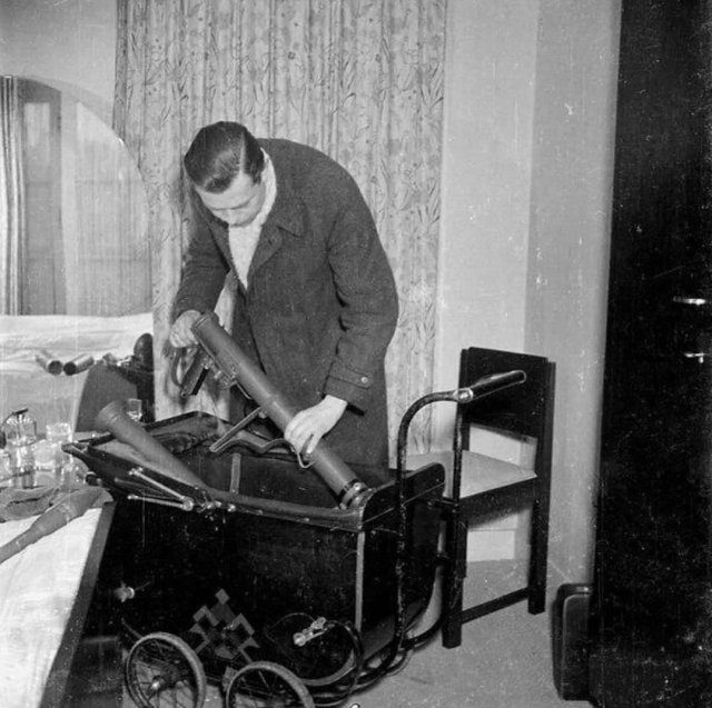 Боец сопротивления прячет минометы в детскую коляску. Амстердам, 1945 год.