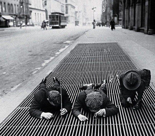 Мальчишки вылавливают мелкие монетки из вентиляционной решетки в Нью-Йорке во время Великой Депрессии, 1930 г.