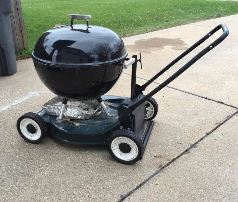 Мужчина прикрепил гриль к старой газонокосилке, чтобы его было легче передвигать