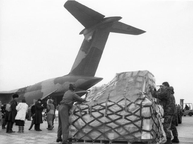 Работники аэропорта разгружают самолет ВВС США, прибывший в Москву с грузом гуманитарной помощи, 1992 год.