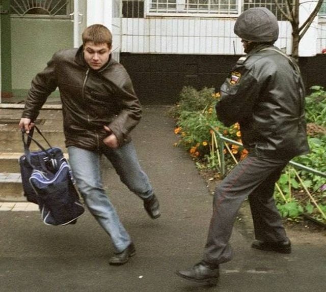 Милиционер нерасторопно пытается задержать преступника, покидающего место преступления, Москва 1999 год.