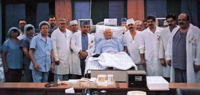 Борис Ельцин в больнице с бригадой врачей-кардиологов после операции на сердце, сделанной ему после напряженной президентской кампании 1996 года.