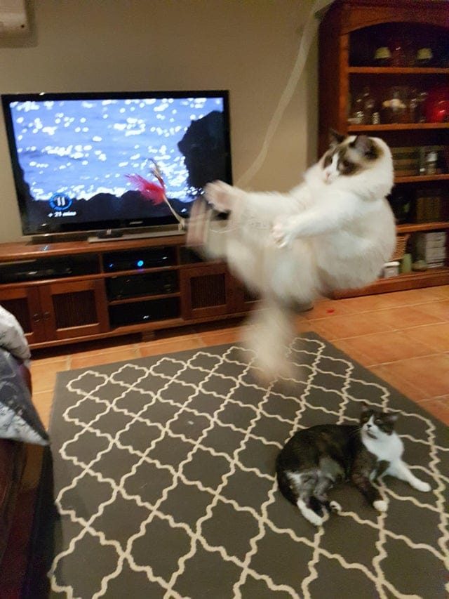 Пытался получить доказательства того, что мой кот может прыгнуть выше головы, когда преследует свою игрушку.