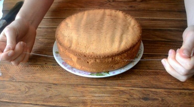 Для тех, кто не умеет или по какой-то причине боится пользоваться ножом для разрезания бисквита на коржи, продвинутые кулинары советуют использовать зубную нить.