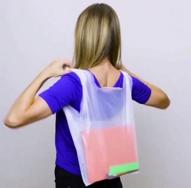 Зачем платить больше и каждый раз тратиться на новомодные сумки и шопперы, когда запросто можно использовать целлофановый пакет в качестве рюкзака по любому удобному случаю.