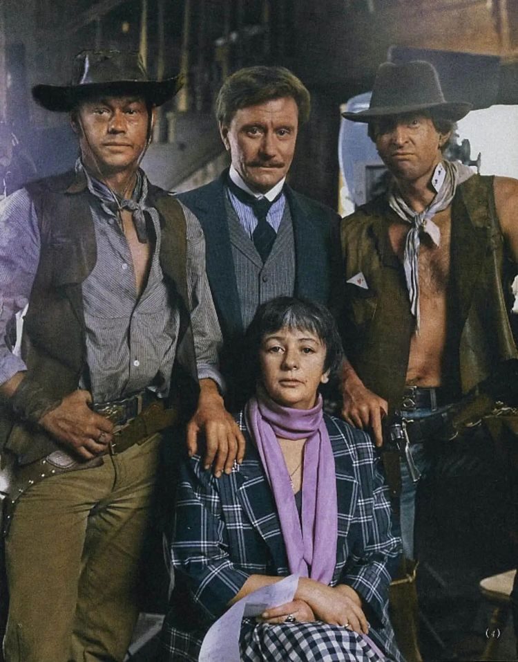 Николай Караченцов, Андрей Миронов, Леонид Ярмольник и Алла Сурикова на съёмках фильма «Человек с бульвара Капуцинов», 1986 год