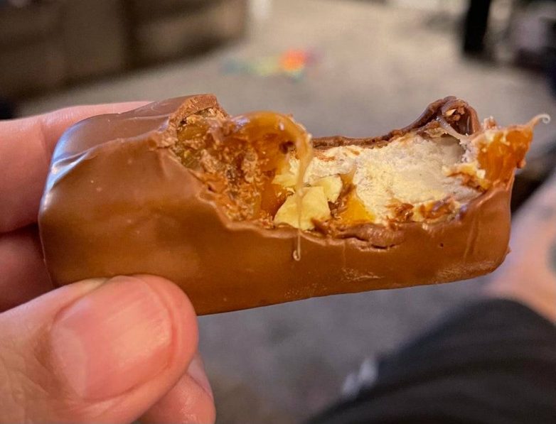Девушка выгрызает из сникерса ту часть, которая ей нравится. И все!