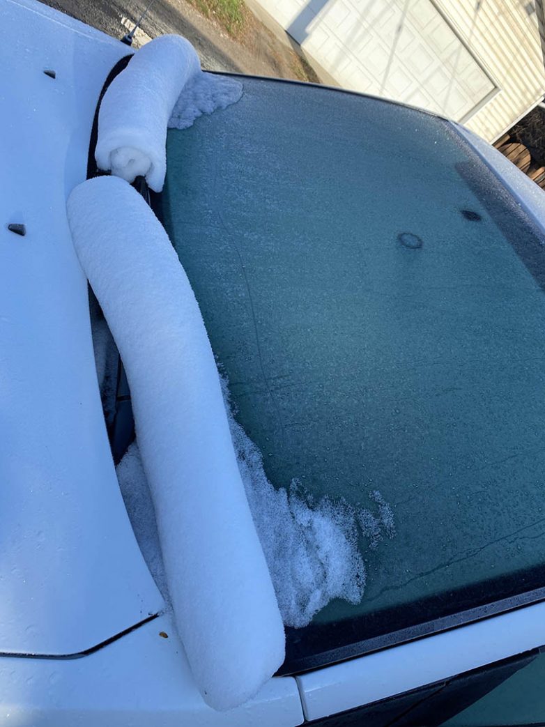 Дворники машины будто бы закутаны в снежные рулоны