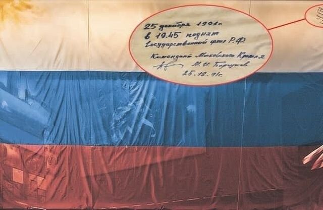 Первый флаг России, поднятый на главном флагштоке страны в Кремле 25 декабря 1991 года, на данный момент хранится в Екатеринбурге