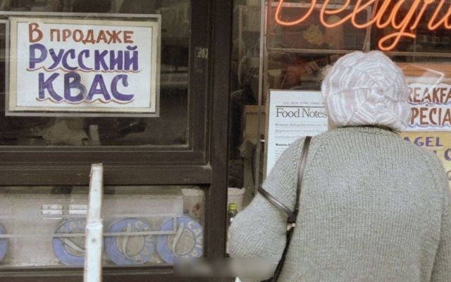 Русская эмигрантка у витрин Брайтон-Бич в Нью-Йорке, 1990 год.