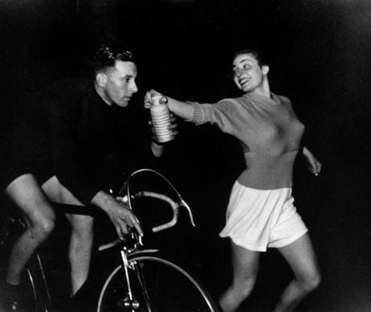 Глоток воды. Британский велосипедист Кен Джой (лучший британский велогонщик 1949–52 гг.) устанавливает рекорд скорости, 1949 год