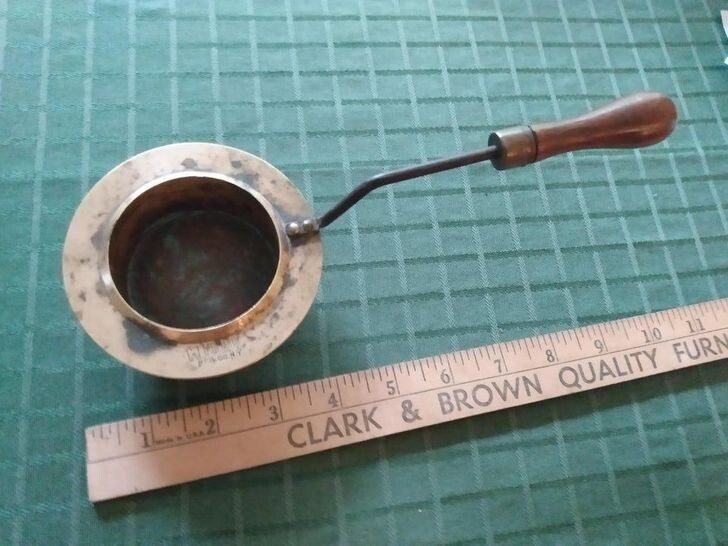 «Тяжелый латунный сосуд с прикрепленной железной ручкой с деревянной насадкой. Есть идеи?»