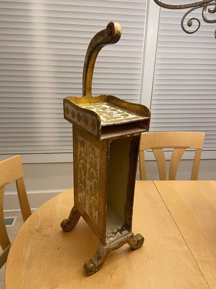 «Нашел у родителей в подвале. Похоже на держатель для книг. Сделано из дерева, роспись довольно потертая. В верхнем отделении нашел кусок газеты, датированный 1967 годом»