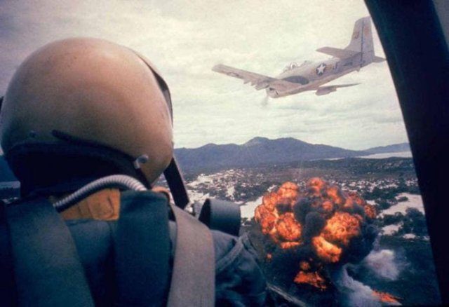 Пилот наблюдает за ударом напалма по позициям вьетконговцев, Вьетнам, 1962 год.
