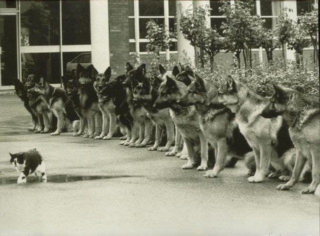 Кот и трeнированные немецкие овчарки — финальный экзамен для служебных собак полиции. ФРГ, 1987 год.