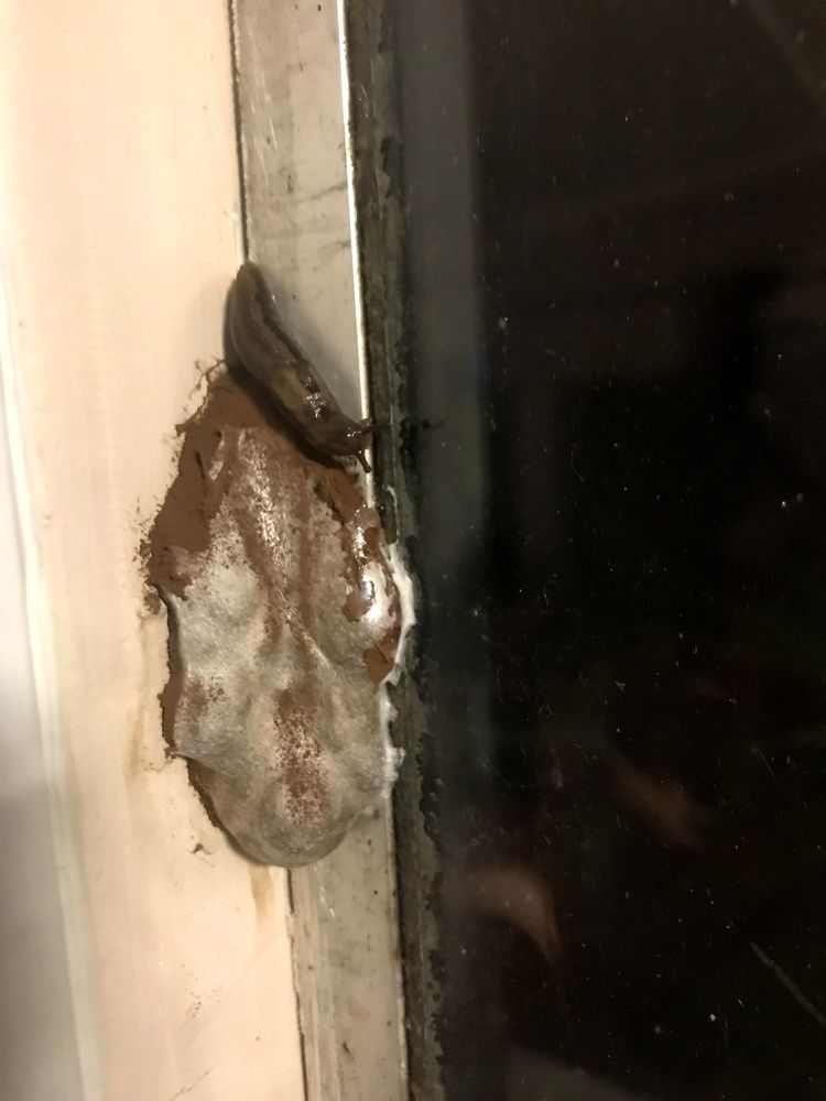 Вопрос: «Нашел это между оконными рамами. Какая-то коричневая субстанция с белым/серебристым налётом сверху. Кажется, слизняк это ест»