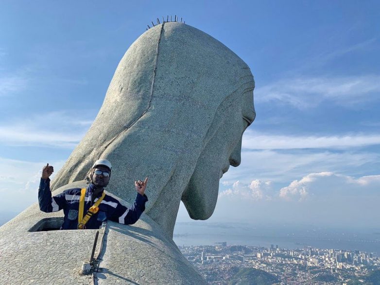 Леса и рабочие на них во время реставрации Статуи Свободы