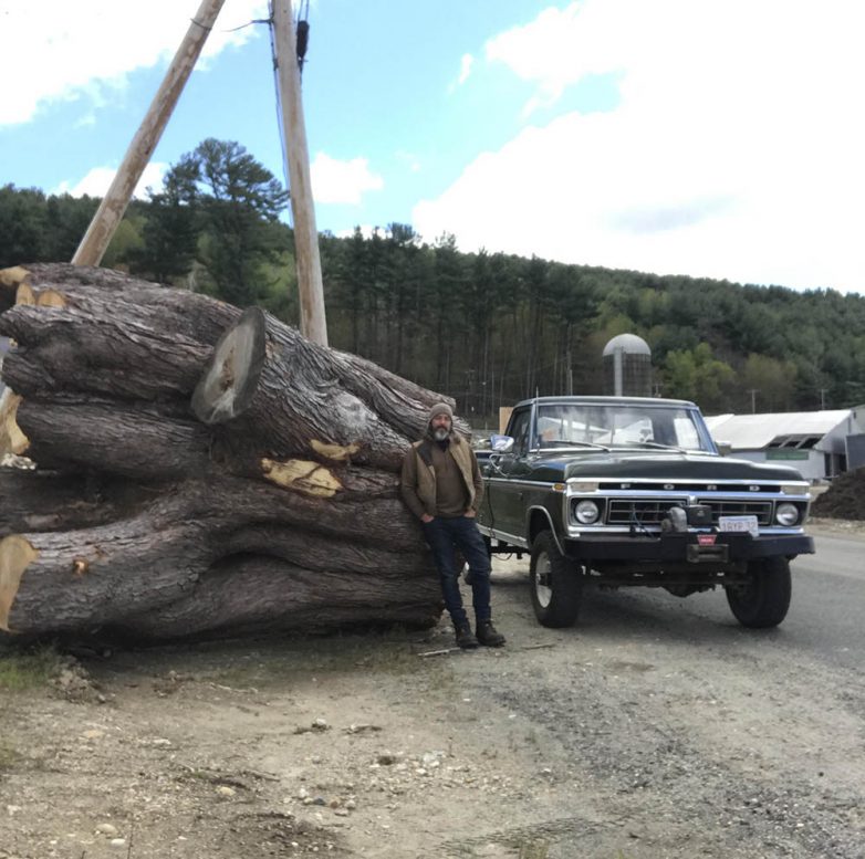 Резчик по дереву рядом с материалом для своей будущей скульптуры