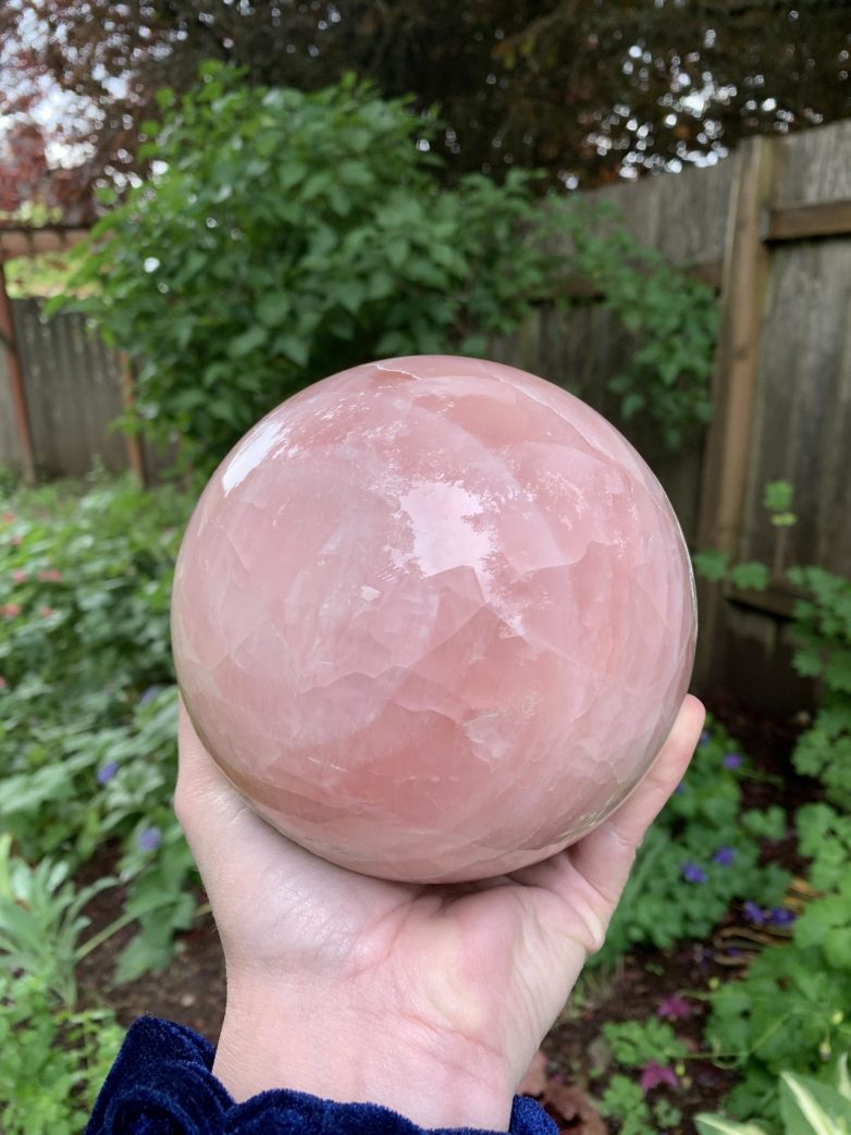 Розовая кварцевая сфера. Она весит более 3 килограмм и почти 14 сантиметров в диаметре