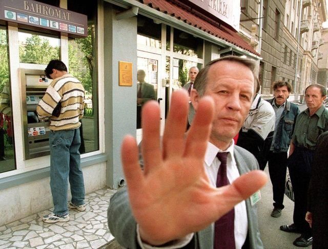 Охранник банкомата препятствует съемке. Во время дефолта 1998 года