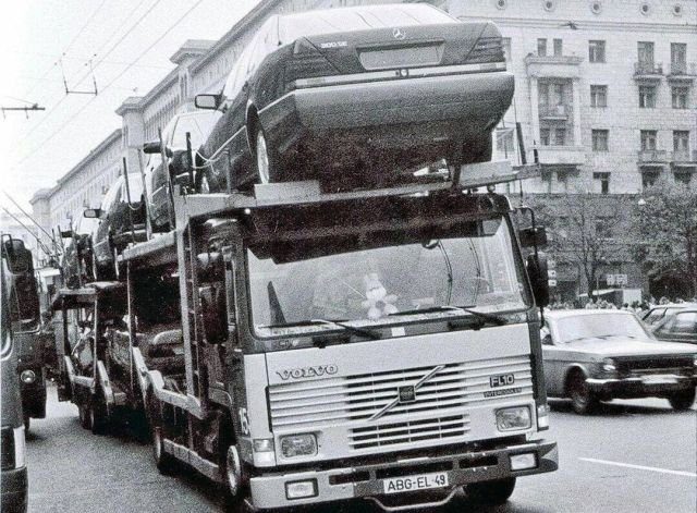 Автовоз Volvo с новенькими Мерседес W140 и W124 на улицах Москвы. 1991 год.