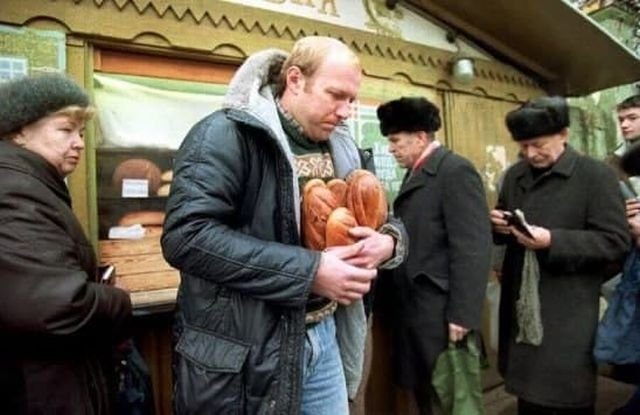 Мужчина уходит от хлебного киоска с несколькими буханками хлеба. Доллар США в настоящее время стоит 398 рублей, а средняя месячная зарплата в России составляет примерно 5000 рублей (12 долларов США) в месяц, 3 ноября 1992 года.