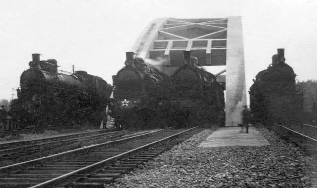 Испытания нового Химкинского моста под тяжестью паровозов, 1937
