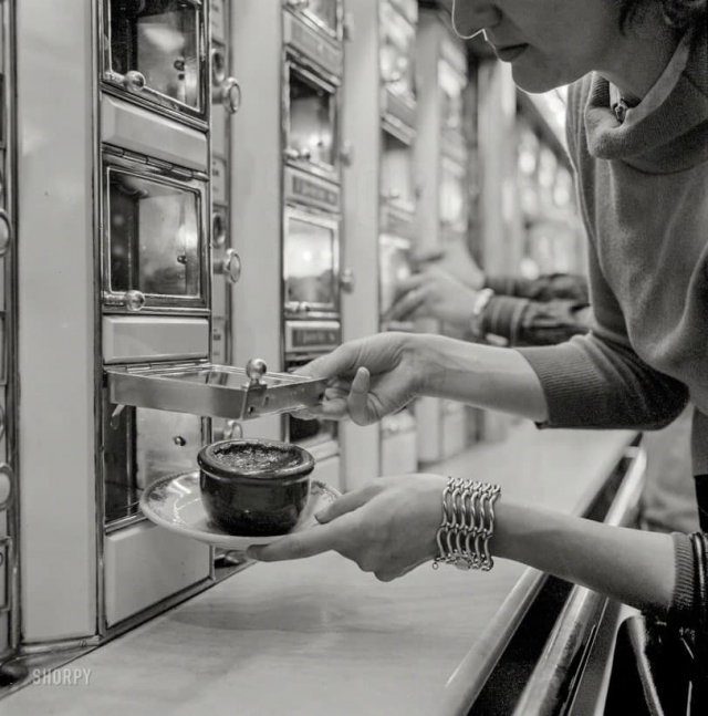 Женщина берет блюдо из запеченных бобов из автомата. Нью-Йорк, июль 1955 года.