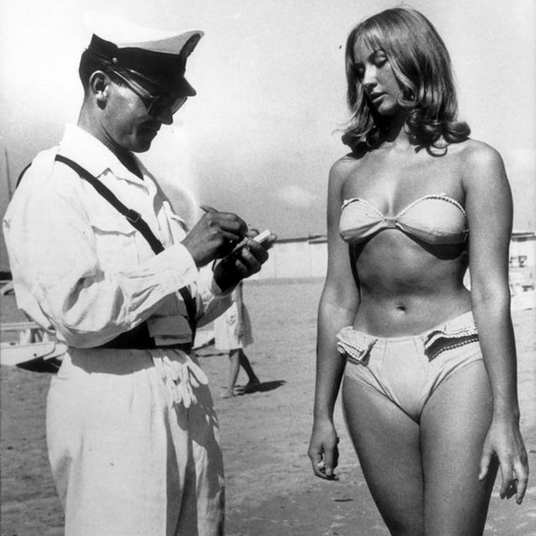 Полицейский выписывает женщине штраф за ношение бикини на итальянском пляже, 1957 год