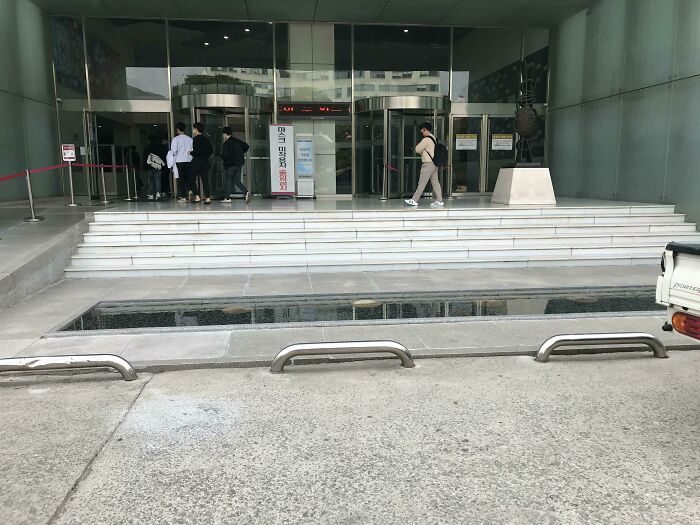 Зачем нужен бассейн прямо перед входом? Кстати, не мелкий – не искупаешься, но обувь промочишь.