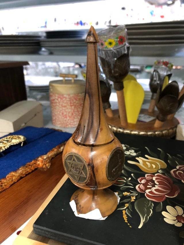Ответ: «Это коробка для специй. Она является частью набора для Хавдалы (еврейская церемония), в который также входят чаша для киддуша и плетенная свеча:»