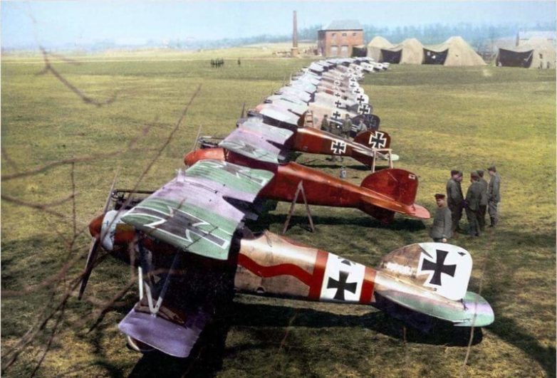 Боевое построение 11-й эскадрильи на аэродроме в Дуэ, апрель 1917 года.