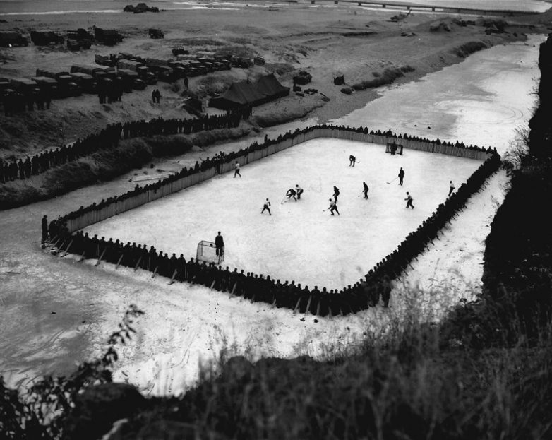 Канадские солдаты, служившие в Корее, сделали импровизированную хоккейную площадку, 1952 год