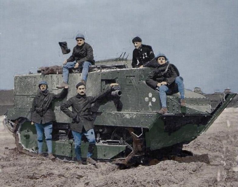 Французский танк «Шнайдер» времен Первой Мировой войны и его экипаж. 1910 год