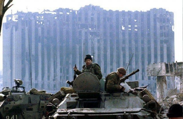 Российские военные на фоне разрушенного Президентского дворца в Грозном, январь 1995 года.