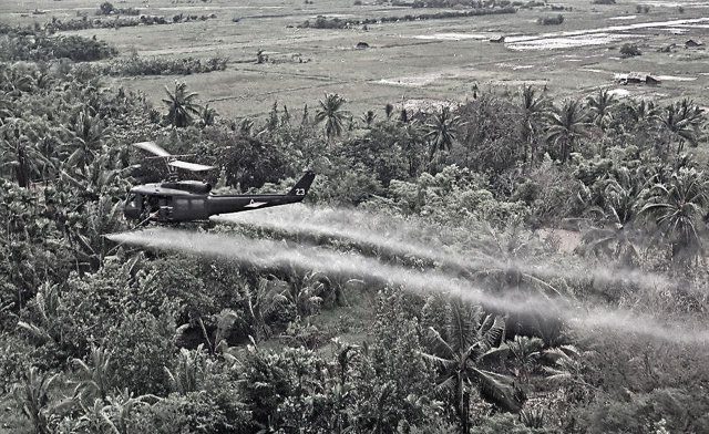 Вертолёт армии США распыляет химическое оружие над джунглями Вьетнама, 1967 г.
